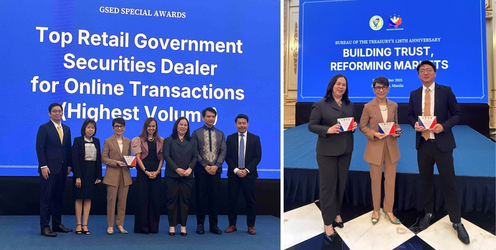 LANDBANK was recognized as one of the Top 10 Government Securities Eligible Dealers (GSEDs) for 2025, and received two special awards as Top Retail GSED for Online Transactions (Highest Volume) and GSED with the Highest Auction Share of Treasury Bonds during the 128th Anniversary Celebration of the Bureau of the Treasury (BTr) and GSED Awarding Ceremony 2025 held on 25 November 2025 in Intramuros, Manila. (Left photo) National Treasurer Sharon P. Almanza (4th from left) presented the award to LANDBANK President and CEO Lynette V. Ortiz (3rd from left), joined by Deputy Treasurers Eduardo Anthony G. Mariño III (leftmost), Ma. Nanette C. Diaz (2nd from left) and Kenneth Ian A. Francisco (rightmost), together with Finance Undersecretary Karlo Fermin S. Adriano (2nd from right) and LANDBANK First Vice President Ma. Francia O. Titar (3rd from right). "This award recognizes the crucial role of GSEDs in the country’s financial ecosystem. By mobilizing savings and channeling them into government securities, we help secure funding for national priorities while empowering Filipinos to participate directly in nation-building," said LANDBANK President Ortiz.