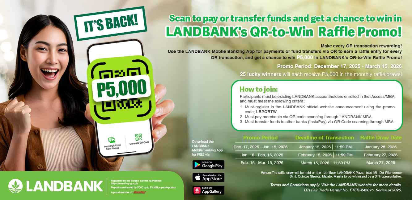 PROMO DESCRIPTION Raffle promo for LANDBANK Mobile Banking App (MBA) users who will utilize the application for merchant payments and interbank fund transfers (lnstaPay) by scanning QR codes. SCOPE The raffle entries will be given only to individuals who will transfer funds and pay merchants using the LANDBANK MBA QR code scanning. One raffle entry per successful transaction. ELIGIBILITY CRITERIA Participants must be existing LANDBANK accountholders enrolled in the iAccess/MBA and must meet the following criteria: 1. Must register in the LANDBANK official website announcement (scan QR) 2. Must pay merchants via QR Code scanning through LANDBANK MBA 3. Must transfer funds to other banks (lnstaPay) via QR Code scanning through MBA PROMO PERIOD December 15, 2025 - March 15, 2026 until 11:59 PM on the last day of the monthly promo period RAFFLE PRIZES Monthly Draws: Three (3) monthly raffle draws. • Monthly Prize: P5,000.00 • Number of Winners: 25 winners per monthly draw. SCHEDULE OF THE RAFFLE DRAWS Monthly Draws: The raffle draws will be held on the 10th floor, LANDBANK Plaza, 1598 MH Del Pilar corner Dr. J. Quintos Streets, Malate, Manila to be witnessed by a DTI representative after each month with the schedule below: PRIZE REDEMPTION 1. Monthly Draws: Winners will receive a prize of P5,000.00 each (25 winners per draw). 2. Prize Credit: Prizes will automatically be credited to the winners' LANDBANK account, used to participate in the raffle, within 3-5 banking days after the raffle draw. 3. Notification: Raffle Winners will be informed via registered mail and SMS. 4. Posting: The names of the raffle winners will be posted on LANDBANK's official social media channels subject to the consent of client SELECTION PROCESS 1. Entry Pool: Individuals who transfer funds and pay merchants via QR code scanning through the MBA before the monthly cut-off will be automatically entered into the pool of entries for the corresponding monthly draw. 2. Raffle Entries: Each fund transfer and payment transaction earns one raffle entry with the Transaction Reference Number serving as the raffle ticket 3. Winner Selection: Winners are randomly chosen through an automated raffle draw based on their Transaction Reference Number 4. Winning Limitation: Participants can win once per draw within the promo period. All raffle tickets will only be qualified for their respective monthly raffle draws, e.g. fund transfers and payment transactions made on December 15, 2025 to January 15, 2026 will only be qualified for the January 28, 2026 monthly raffle draw and excluded in the February 2026 and March 2026 monthly draws. 5. Account Status: The winner's LANDBANK account must be active and not closed during the raffle draw date. 6. Disqualification: Employees of Land Bank of the Philippines, its promo partners, organizers, including their relatives up to the second degree of consanguinity or affinity are disqualified from participating in the promo.