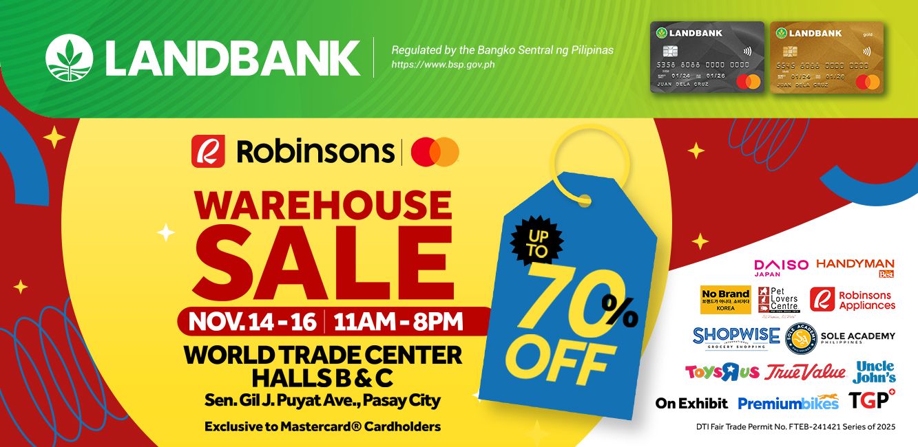 Promotion Details • Promo Name: The Robinsons Warehouse Sale • Promo Period: November 14–16, 2025 • Eligibility: All Mastercard Credit and Debit Cardholders with active accounts in good standing • DTI Fair Trade Permit No. FTEB-241421 Series of 2025 Promo Mechanics • Enjoy up to 70% OFF on select merchandise items • Avail of Buy 1 Take 1 deals on select items • Offers are available at the Robinsons Warehouse Sale across participating Robinsons Group brands • Promo is non-transferable, non-refundable, and not convertible to cash • Cannot be used in conjunction with other discounts or promotional offers Participating Robinsons Group Brands • Daiso • Handyman • No Brand • Pet Lovers Center • Robinsons Appliances • Robinsons Department Store • Shopwise • Sole Academy • Southstar Drug • Super 50 • Toys”R”Us • True Value • Uncle John’s Brands on Exhibit • Premium Bikes • TGP