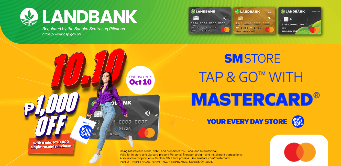 Mastercard 10.10. Promo with SM Store Eligibility 1. The Promotion is open to all principal and supplementary cardholders of Mastercard credit, debit, and prepaid cards (Local & International). 2. To join the Promotion, cardholder must tap a valid Mastercard card for a minimum P10,000 single receipt purchase (straight or Installment) at any participating branch of SM Store. 3. Straight and installment transactions using a valid Mastercard card in-store and personal shopper paid via card present are eligible for the promotion, transactions paid via iPay88/emall billing are excluded in the promo. 4. Cardholders whose accounts are suspended or terminated are not eligible to join the promotion. Promotion Mechanics and Conditions 1. Mastercard cardholders can enjoy an instant fixed discount of P1,000 with a minimum single-receipt purchase of P10,000 (straight or installment transaction) at any SM Store branch nationwide during the promo period. 2. Promo period is on October 10, 2025. 3. All Mastercard transactions must be made within the promo period to avail of the discount. 4. Upon completing the minimum single-receipt Mastercard card transaction, the POS will automatically award the P1,000 discount. 5. Discounts are applied at the point of sale for qualified transactions and are applicable to all items. 6. The minimum purchase requirement is defined as net of all applicable discounts (i.e. class discounts, SMAC/SM Prestige discounts, and other SM discounts). 7. Offer is non-transferable, non-refundable and non-convertible to cash. 8. Promo is in conjunction with other Mastercard promotions within SM Store. 9. Splitting of transactions for the purpose of getting multiple discounts is not allowed. Per DTI Fair Trade Permit No. FTEB- 237002 Series of 2005