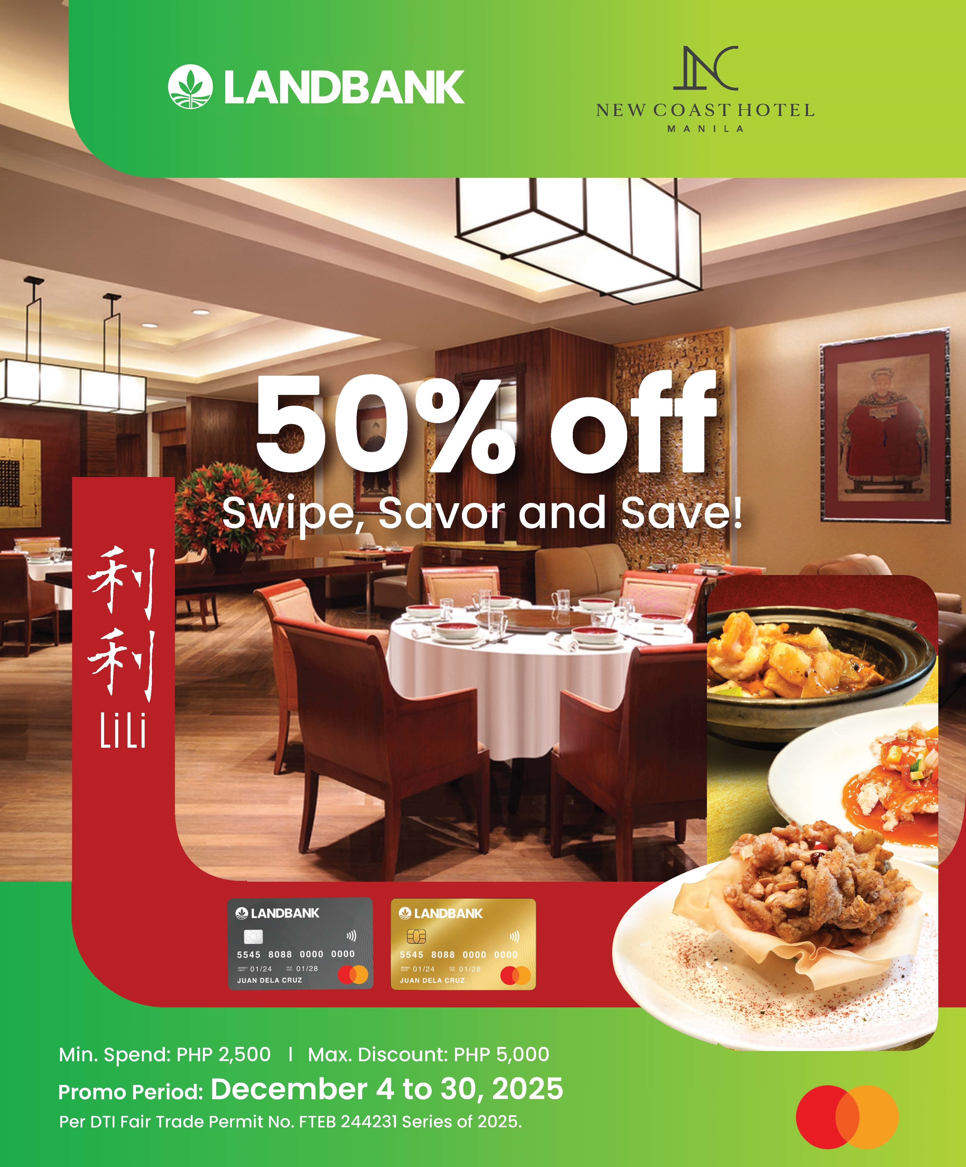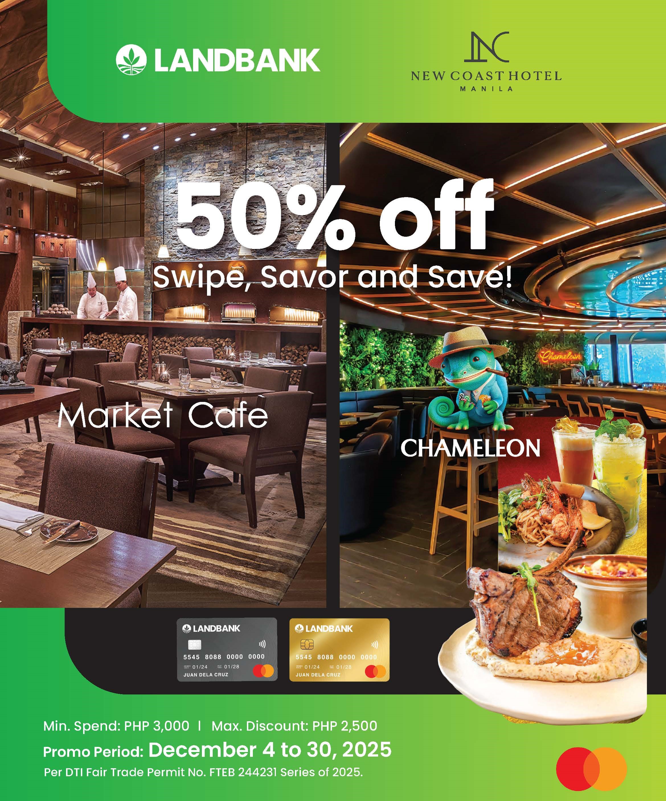 HOW TO AVAIL 1. Visit any participating restaurant of New Coast Hotel Manila during the promo period. 2. Order food and beverages that meet the minimum spend requirement. 3. Present your LANDBANK Mastercard Credit Card to the cashier upon billing. 4. Pay the full qualified amount using the LANDBANK Mastercard Credit Card. 5. The applicable discount will be automatically applied to the bill. 6. Cardholder must confirm that the discount has been reflected before final payment. TERMS AND CONDITIONS 1. This offer is available to all LANDBANK Mastercard Credit Card holders whose accounts are active, updated, and in good standing. 2.To be eligible, cardholders must use their LANDBANK Mastercard Credit Card to settle payments for purchases made within the official promo period. 3. Only transactions made directly with the participating merchant will qualify for the promotion. 4. Discounts are valid only for dine-in transactions at participating restaurants and are not applicable on holidays (December 24 - 25, 2025) . 5. Minimum spend applies to the total food & beverage bill before discounts & applicable charges. 6. Splitting transactions is not allowed. The minimum spend must be settled in one single transaction. 7. The offer is strictly non-transferable and cannot be redeemed for cash or gift certificates. 8. It may not be combined with any other ongoing promotions, packages, special offers, or discounts. 9. For items and services already subject to promotional pricing, senior citizens and persons with disabilities (PWDs) may choose between the promotional discount or the discount provided under the Expanded Senior Citizens Act of 2010 and R.A. 10754 or the Act Expanding the Benefits and Privileges of Persons with Disabilities, whichever offers the greater benefit. 10. Non-compliance with any of the stated terms and conditions may result in disqualification from the promotion. LANDBANK and the partner merchant reserve the right to deny participation at their discretion. Per DTI Fair Trade Permit No. FTEB 244231 Series of 2025.