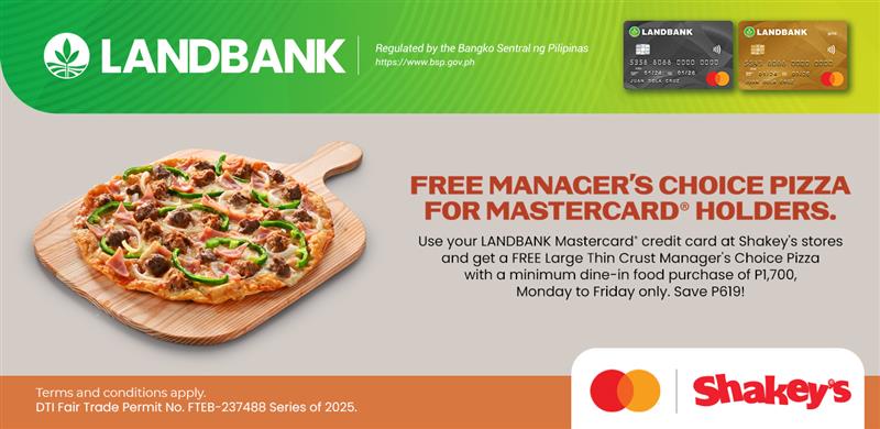 Don't miss out on this Mastercard Priceless Treat! Dine at your nearest Shakey's store and enjoy a FREE Large Thin Crust Manager’s Choice Pizza when you spend a minimum food purchase of ₱1,700 with your Mastercard Credit Card. Save ₱619! Promo runs from September 24 to October 21, 2025. Valid Monday to Friday. Available at all Shakey's stores except MCIA 1 and 2, and Enchanted Kingdom. So grab your Mastercard, head to your nearest Shakey’s, and treat yourself to this delicious deal! Mechanics: 1. Use your Mastercard at Shakeys stores and get FREE Large Thin Crust Manager's Choice pizza for a minimum DINE IN food purchase of P1,700 from Monday-Friday only. Save P619. 2. Mastercard cardholders can avail of the Promo at/on Shakey's branches except MCIA 1 & 2 and Enchanted Kingdom. 3. Splitting of transaction is not allowed. 4. Only one (1) qualified Mastercard Credit Card may be used per single-receipt transaction, 5. The offer is for dine in transactions only. Beverages are excluded in the promo's spend requirement. 6. The Promo offer is inclusive of Value Added Tax ("VAT") and subject to applicable service charges and local taxes unless otherwise specified by partner merchant. 7. The offer cannot be exchanged for cash / service, other products, or discounts. The offer is not transferable and cannot be used in conjunction with other discounts, promotional offers. 8. In the purchase of goods and services which are subject of this promo, senior citizens or persons with disability (PWD) can either avail of the promo or discount provided under the Expanded Senior Citizens Act 2010 oF Magna Carta for Persons with Disability, Whichever is higher. 9. In case of dispute in respect with Mastercard and the cardholder's availment of the promo, the decision of Mastercard shall be considered final, with prior approval of the DTI-FTEB. Per DTI Fair Trade Permit No. FTEB-237488 Series of 2025