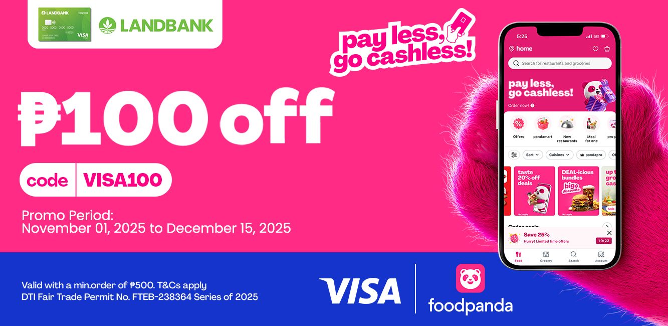 Get P100 OFF on your foodpanda order with your Visa card! Qualifications 1. Customer must not have any cashless order in the last 90 days 2. New customers who purchase with a Visa credit, debit, prepaid cards issued in the Philippines that don't have any foodpanda cashless orders How to Avail To avail of the discount, Cardholder must go to www.foodpanda.ph or download the foodpanda mobile app on the App Store or Google Play and proceed with the following steps: 1. Sign up or Log in 2. Input the delivery location 3. Choose from the available restaurants/shops under Delivery and Pick-up in the area 4. Place order worth at least the minimum order value 5. Tap “Apply a voucher” and enter applicable Voucher Code. 6. Pay using a qualified card. Discount is applied to the total purchase upon checkout Terms and Conditions 1. Partner is not an agent of any of the participating merchants or outlets and makes no representation as to the quality of goods and services provided. All feedback regarding the quality of goods and services provided should be directed to the respective merchant or outlet. 2. The Promo cannot be exchanged for other items or discounts and cannot be used in conjunction with other promotional offers by the partner merchant that requires a voucher/promo code. 3. The offer is not convertible to cash or credit. It may not be exchanged with any other product. 4. In case of dispute in respect of the Partner only and the clients' availment of the Promo, the decision of the Partner with the concurrence of DTI shall be considered final. However, if dispute involves the Foodpanda and its performance and/or delivery of services to customers, subject to the Terms and Conditions set out below, the decision of Foodpanda with the concurrence of DTI shall be considered final 5. The Promo shall be subject to periodic review to ensure compliance with the Partner’s policies and procedures, as well as with BSP rules and regulations and applicable laws. 6. Terms and conditions governing the Partner’s products, services, facilities and channels, which are made an integral part of hereof by reference, shall likewise be resorted to in instances where they are applicable to the Promo. 7. Vouchers, discounts and promos and the use of the foodpanda platform shall likewise be governed by the foodpanda Terms of Use and pandapro Terms and Conditions. Offer Description 1. Code: VISA100 2. P100 off, min spend P500 3. Minimum spend per transaction: Php 500 Minimum spend is based on gross food order value which is defined as the user’s total food order value before any discount and shipping are applied. 4. Valid on all verticals - food delivery and pick up, shops, and pandamart 5. Valid for new foodpanda users with no cashless orders AND any existing customer without a cashless order in the last 90 days 6. Each discount voucher can be used by a qualified new user on foodpanda 7. Up to: One (1) time/s per foodpanda user ID during the promo period Customer Support Any issue on the actual purchase should be directed and will be resolved by Foodpanda Philippines. For promo-related concerns and inquiries, Cardholder may reach out to Foodpanda’s customer support at support@foodpanda.ph or via the live chat on Foodpanda app. DTI Fair Trade Permit No. FTEB-238364 Series of 2025.